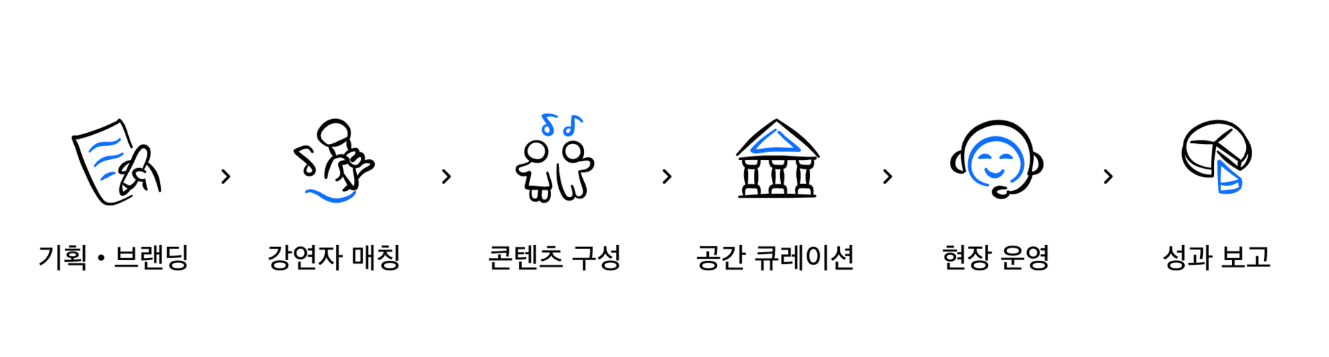공간 구성과 동선을 설계하고, 케이터링 등 현장 운영 요소까지 감각적으로 연출해 몰입도 높은 예술 경험을 완성합니다.