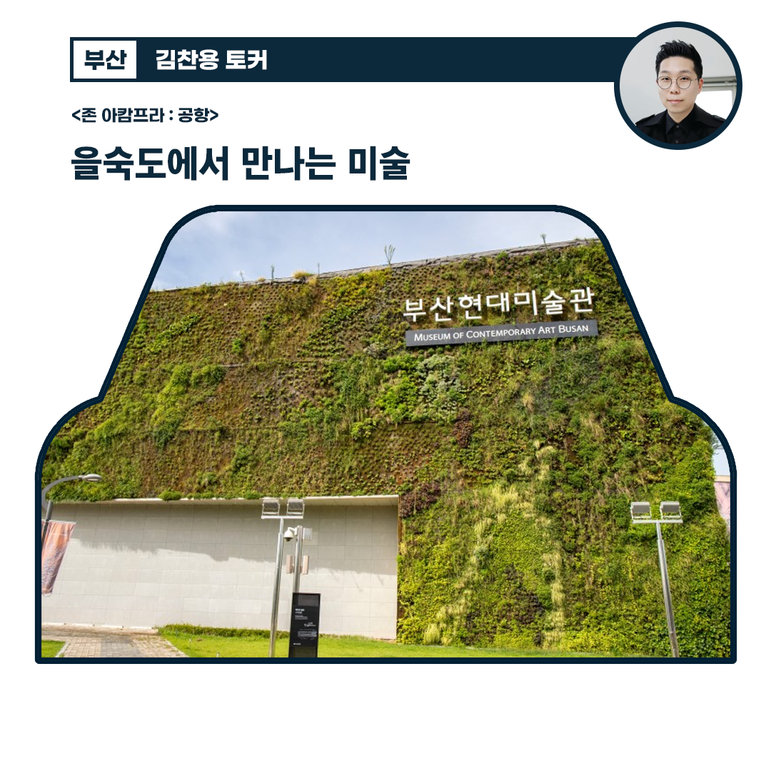 부산현대미술관은 외관부터 관객의 눈길을 사로잡는다. '수직 정원의 거장'이라 불리우는 패트릭 블랑이 식물 175종을 심어 디자인한, 건물 내/외부를 수직으로 자라게 하는 정원으로 꾸며져 있기 때문이다. 이 미술관의 정체성의 근간이자 기초자료라 할 수 있는 곳은 바로 소장품 전시를 위한 공간, '소장품섬'이다. 그리고 <존 아캄프라 : 공항>은 소장품섬에서 펼쳐지는 첫번째 전시다. '소장품섬'이라는 공간의 명칭은 부산현대미술관이 위치한 을숙도가 지닌 가치들을 공유하고자 하는 데서 비롯되었다. 을숙도는 고립적인 섬의 지리적 한계를 가지면서도 부산 외곽과 도심을 잇는 지점에 자리하여 아름다운 자연을 마주할 수 있는 곳이다.