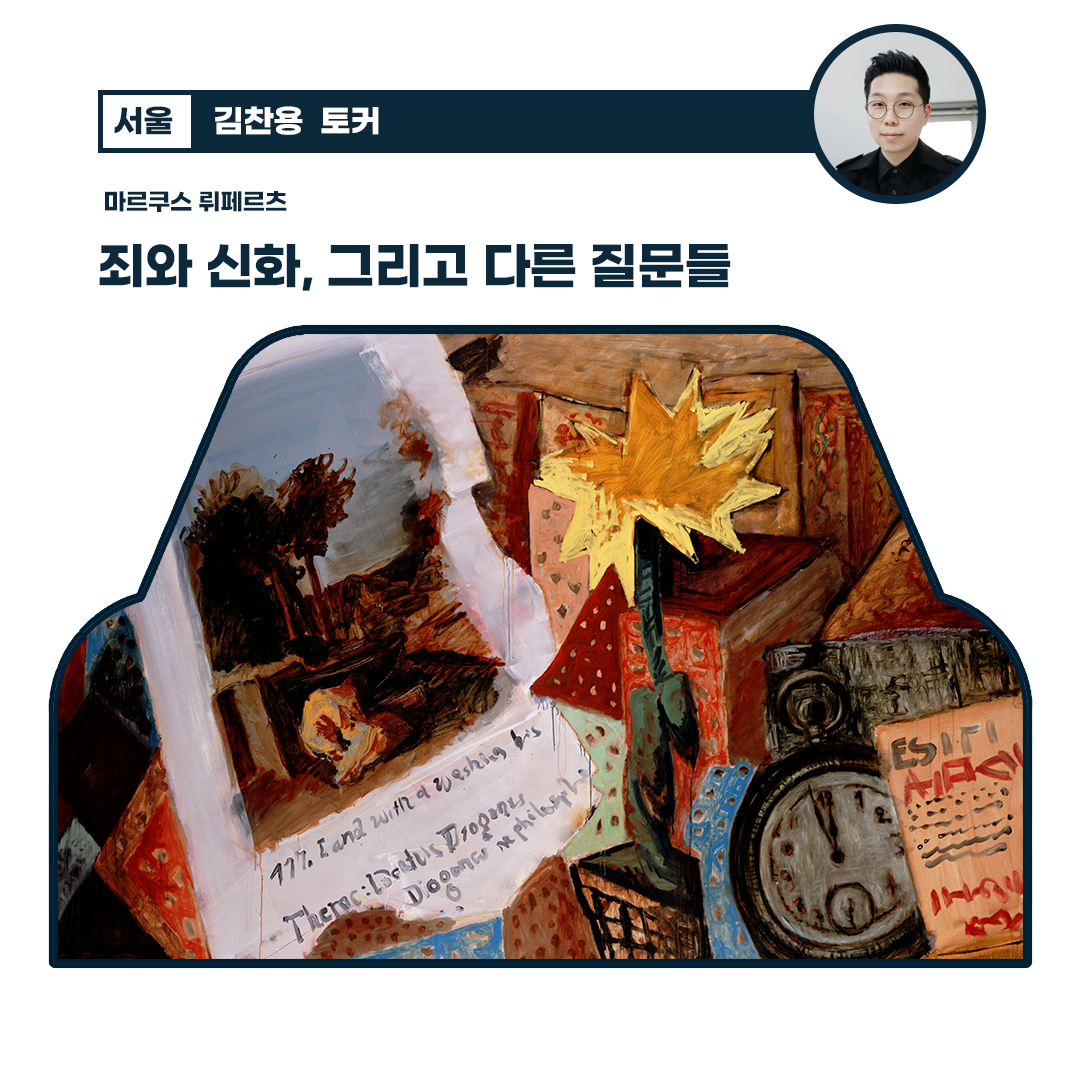독일 현대미술계의 중심적인 작가 마르쿠스 뤼페르츠(Markus Lüpertz, b.1941)의 개인전 "죄와 신화, 그리고 다른 질문들(Sins, Myths and Other Questions)"은 지난 80년대 후기작부터 최근작까지 마르쿠스 뤼페르젊은츠의 모든 예술관을 관통하는 '디티람브(Dithyramb)' 개념에 기반한 33개의 회화와 8개의 조각을 선보인다.