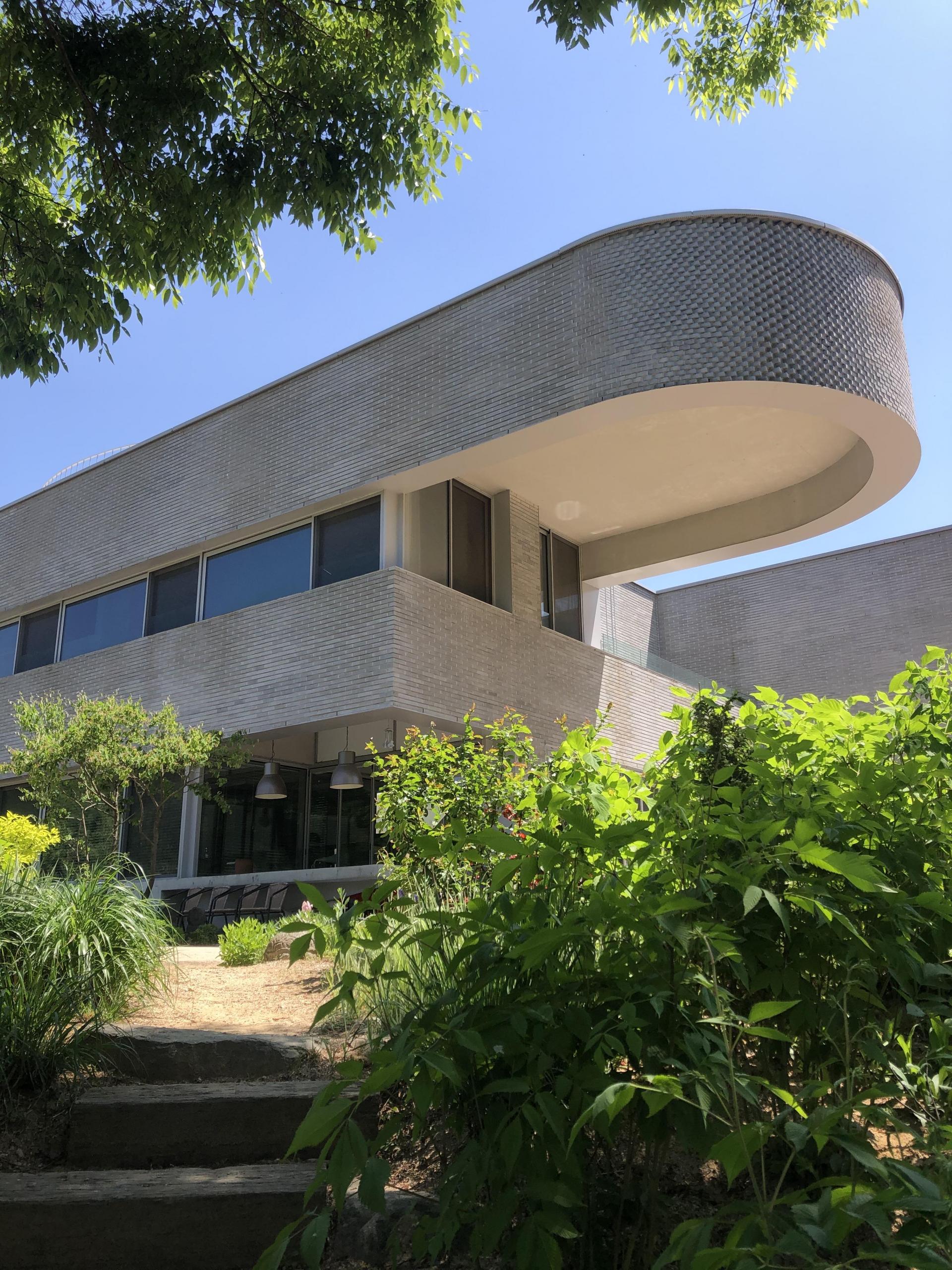 미술관의 외관은 여러 방향에서 각각 주변과 어울려 반응하면서도 동시에 하나의 조형적 덩어리로 존재합니다. 건물의 매스는 자연스럽게 그늘이 있는 쉼터를 만들고, 잔디 정원에서는 단단하게 선 수직면이 식재와 예술 작품의 배경이 되기도 합니다.