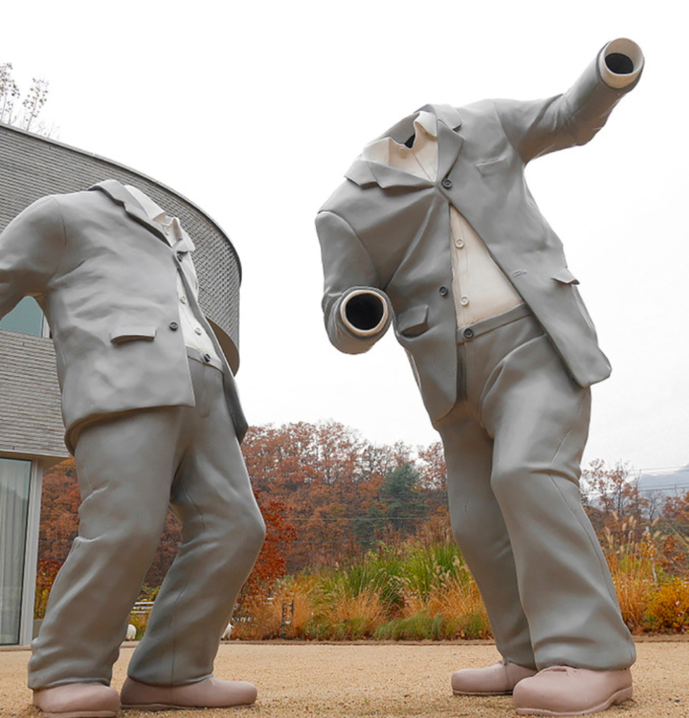 이 작품에서 ‘옷’이라는 소재는 인간의 ‘사회적인 행위’를 의미하게 됩니다. 딱딱하게 정장을 입고 가만히 서 있는 모습이 아닌, 거부하거나 피하는 듯한 움직임은 정책이나 규율을 맹목적으로 따르지 말고 그 정당성에 적극적으로 의문을 가져볼 것을 제안하는 의미라고 해요. 이렇듯 해학적이며 비범한 방식으로 표현되는 그의 작품을 통해 작가는 사회적 정치적 신념과 세태를 풍자하는 시선을 담아냅니다.
