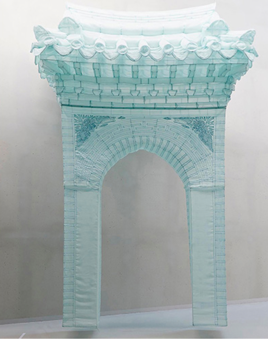 <Gate-Small>은 한국 전통 건축물의 문 형태를 반투명한 실크천으로 만든 것으로, 천장에서 내려오는 와이어 끝에 매달린 디스플레이 방식으로 인해 더욱더 가벼워 보이는데요. 육중한 무게감으로 땅에 뿌리를 박고 있는 실제 문과는 달리 이 작품은 개념적으로 마치 옷을 접어 여행 가방에 넣고 다니듯 소지하거나 이동이 가능한 형태이죠. 자국과 타국 사이, 어디에도 뿌리 내릴 수 없이 이동에 익숙해져야 했던 작가 개인의 삶을 그대로 담아낸 작품입니다.